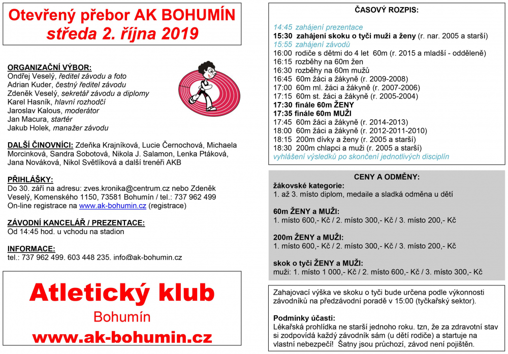 Poslední letošní závod na dráze se uskuteční ve středu 2. října a registrovat se můžete on-line do pondělí 30. 9. (do 12:00 v menu "registrace") a nebo přímo na stadionu a to od 14:45 (nejpozději 30´ před začátkem disciplíny!). První běžecký start je plánován na 16:00 a to se na trať vydají rodiče s dětmi, tyčkaři začínají o 30´ dříve. Kompletní propozice i plakát najdete v menu ("ke stažení) a nebo na www.facebook.com/AKBohumin.